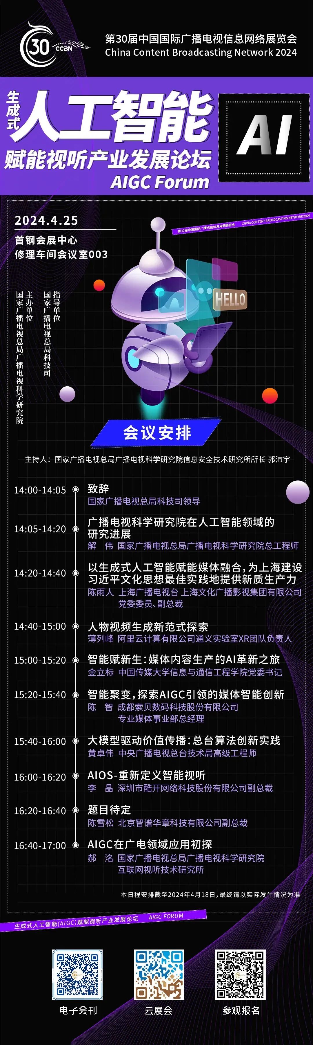 CCBN2024生成式人工智能(AIGC)赋能视听产业发展论坛议程发布