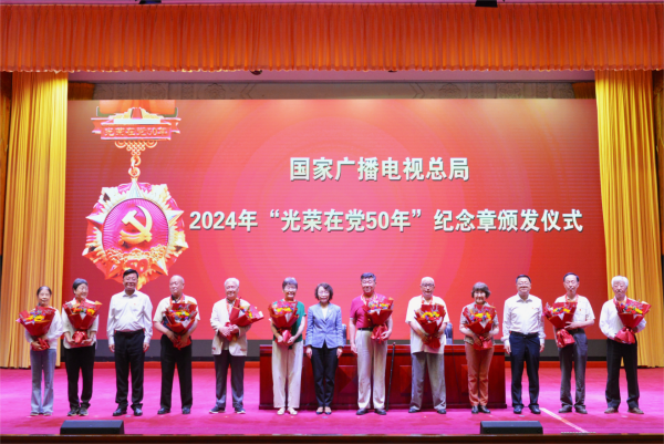 党课前,曹部长代表总局党组对各位老党员为党的事业所作的贡献、付出的辛劳表示衷心感谢和崇高敬意,称他们是广电事业改革建设发展的亲历者、见证者和贡献者,全体党员干部要传承精神、守正创新、凝心聚力、接续奋斗。广电总局党组成员为10位“光荣在党50年”老党员代表颁发纪念章。我院李景升同志作为广科院“光荣在党50年”老党员代表参加颁章仪式。