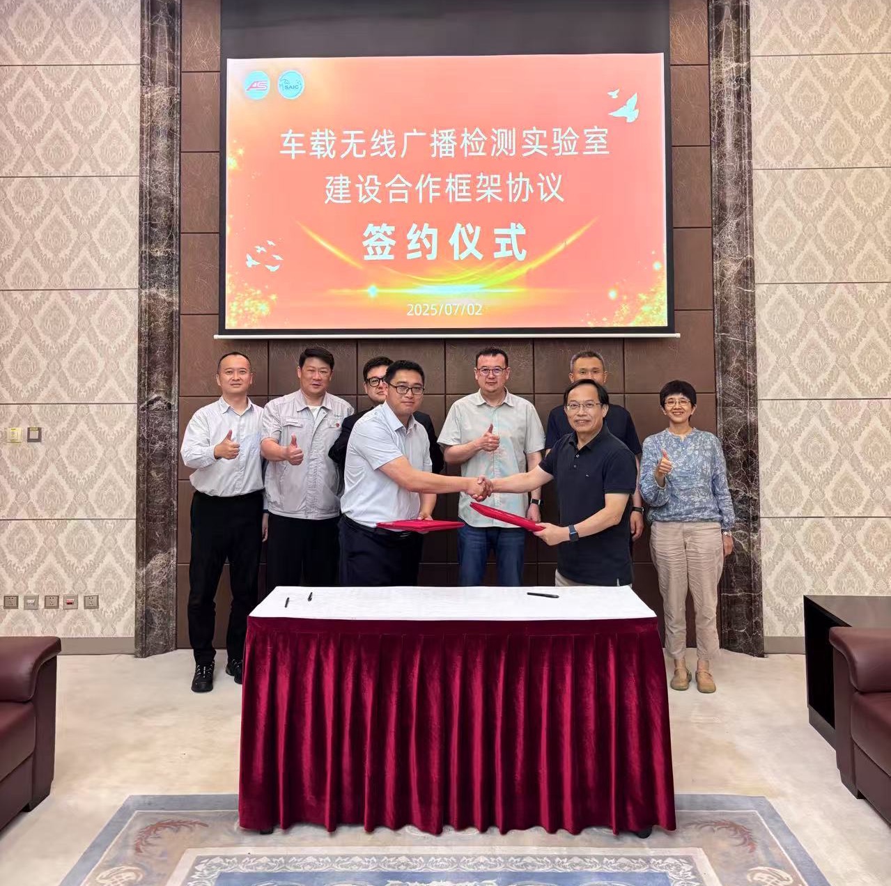 7月2日,广播电视科学研究院(简称“广科院”)与上汽海外出行科技有限公司(简称“上汽海外出行”)共建“车载无线广播检测实验室”签约暨揭牌仪式在上汽海外出行成功举行。广科院副院长张伟、上汽海外出行副总经理陆珉见证签约并进行实验室揭牌,上海机动车检验中心有限公司总经理王伟樑及实验室各方代表参加上述仪式。
