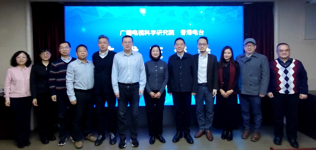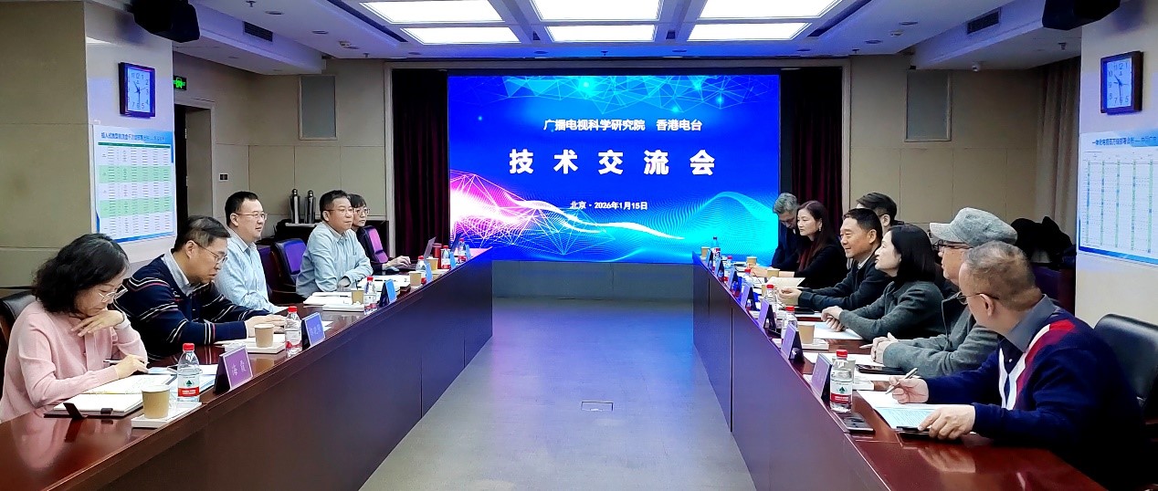 2026年1月15日上午,广科院与香港电台代表团进行交流,双方围绕超高清、视频修复等技术开展研讨。广科院副院长张伟、总局香港记者站站长王喜凯、处长张民参加会议。