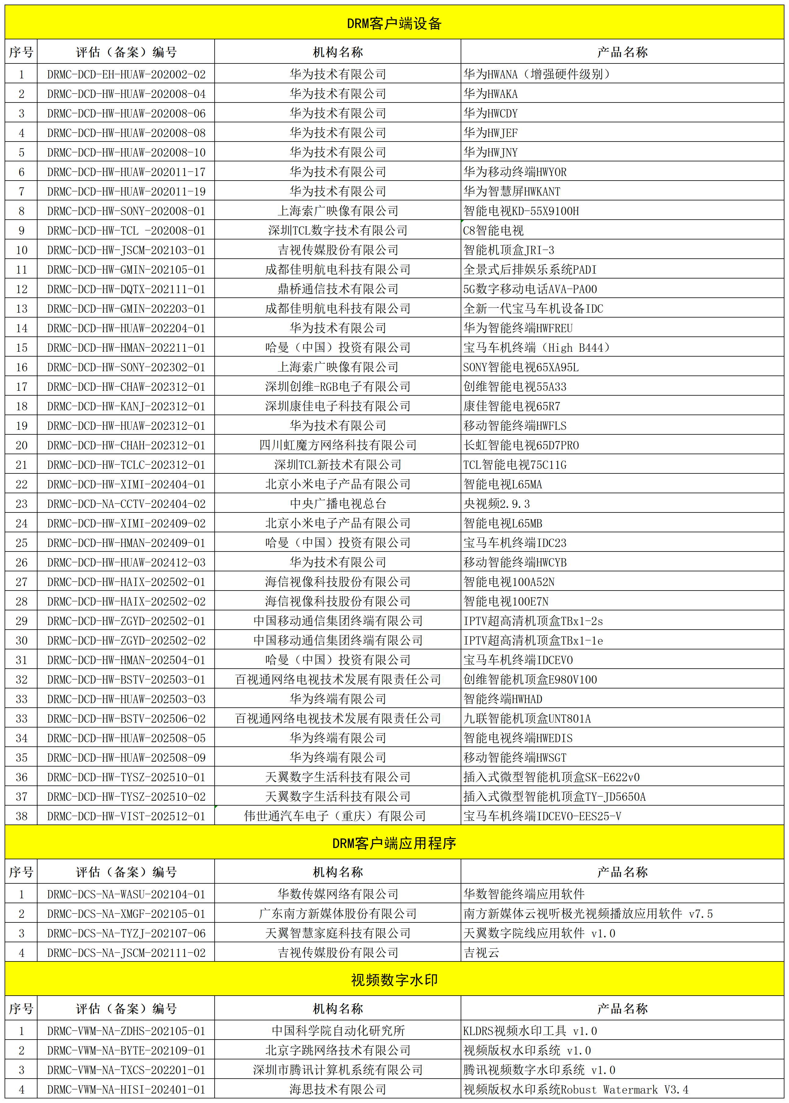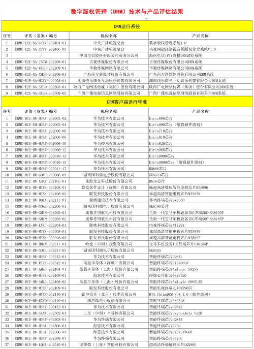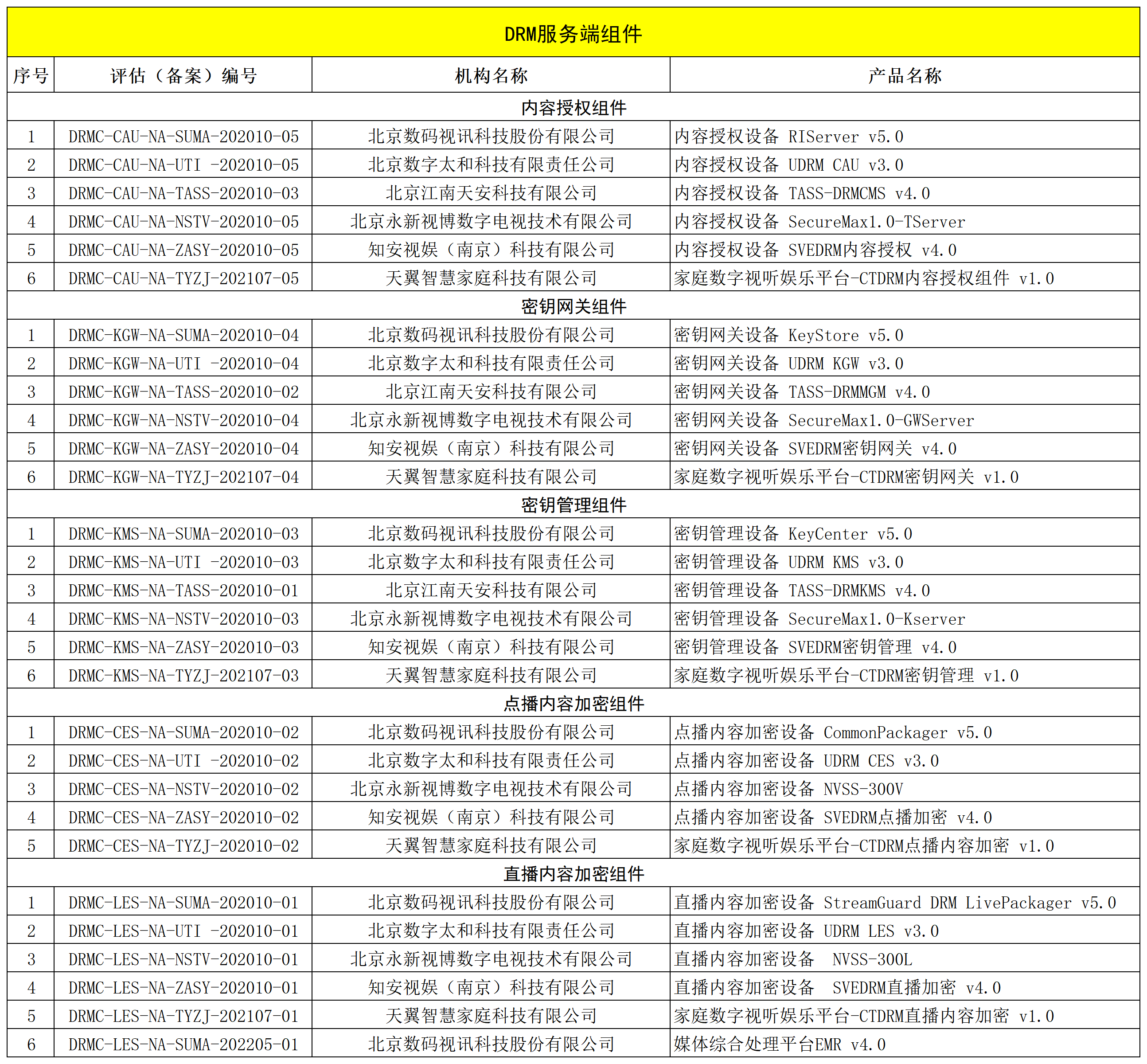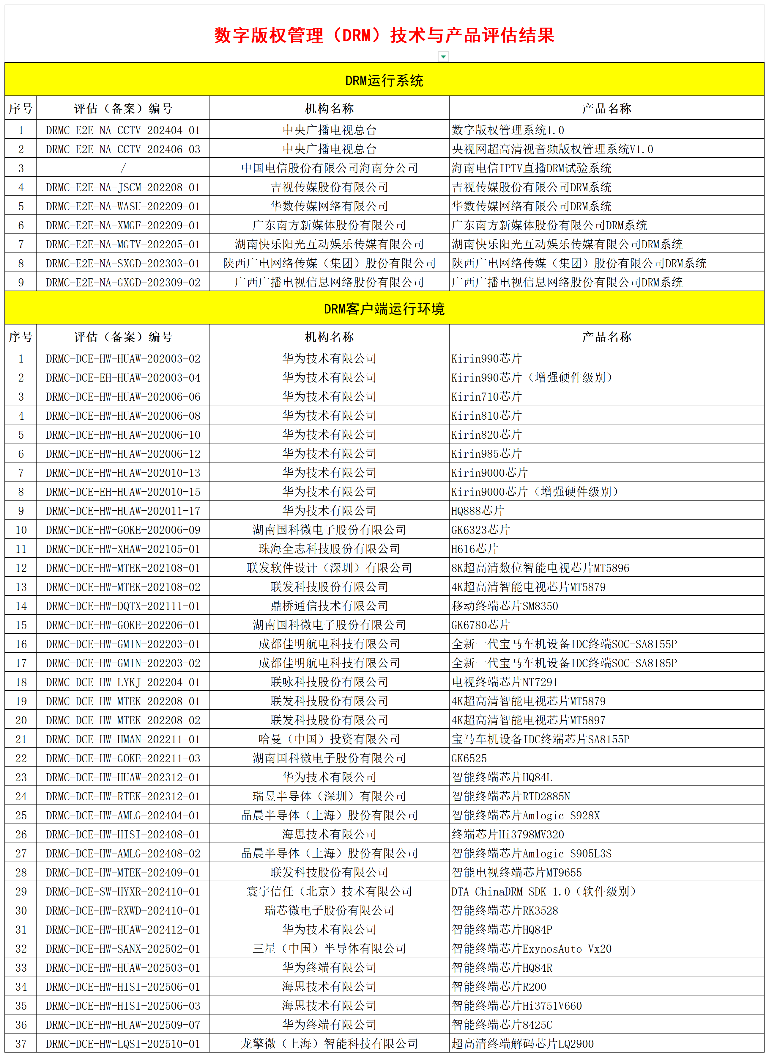 截至2025年12月31日,共有9项DRM运行系统、37项DRM客户端运行环境、38项DRM客户端设备、4项DRM客户端应用程序、4项视频数字水印、29项DRM服务端组件通过评估。